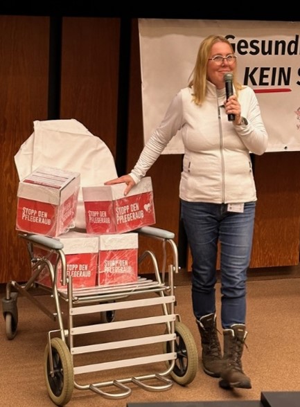 SALK Zentralbetriebsratsvorsitzende Sabine Gabath mit 16.000 der insgesamt 75.000 Unterschriften gegen das Sparpaket